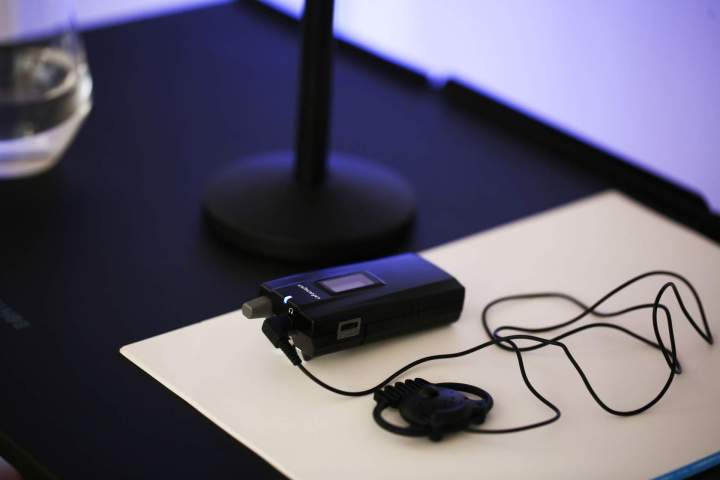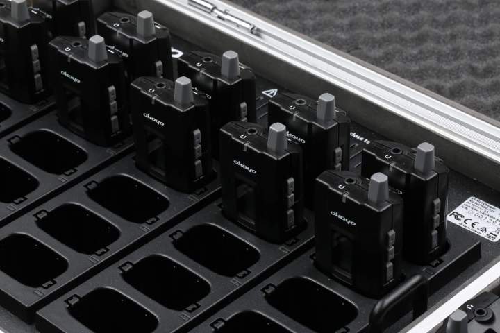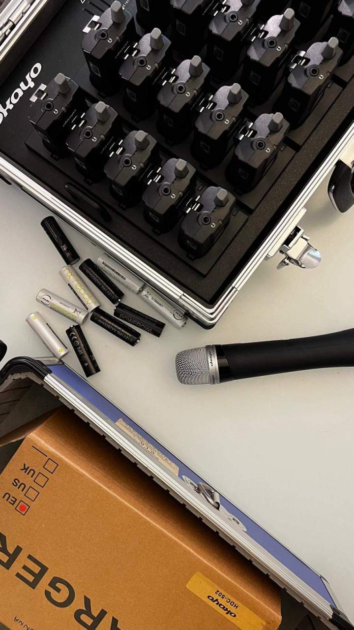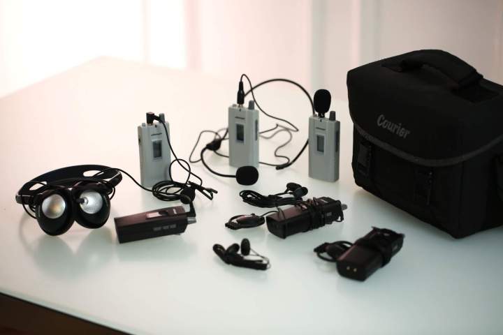 Le kit rassemble un micro interprète et des récepteurs ou des oreillettes et une valise de charge.
